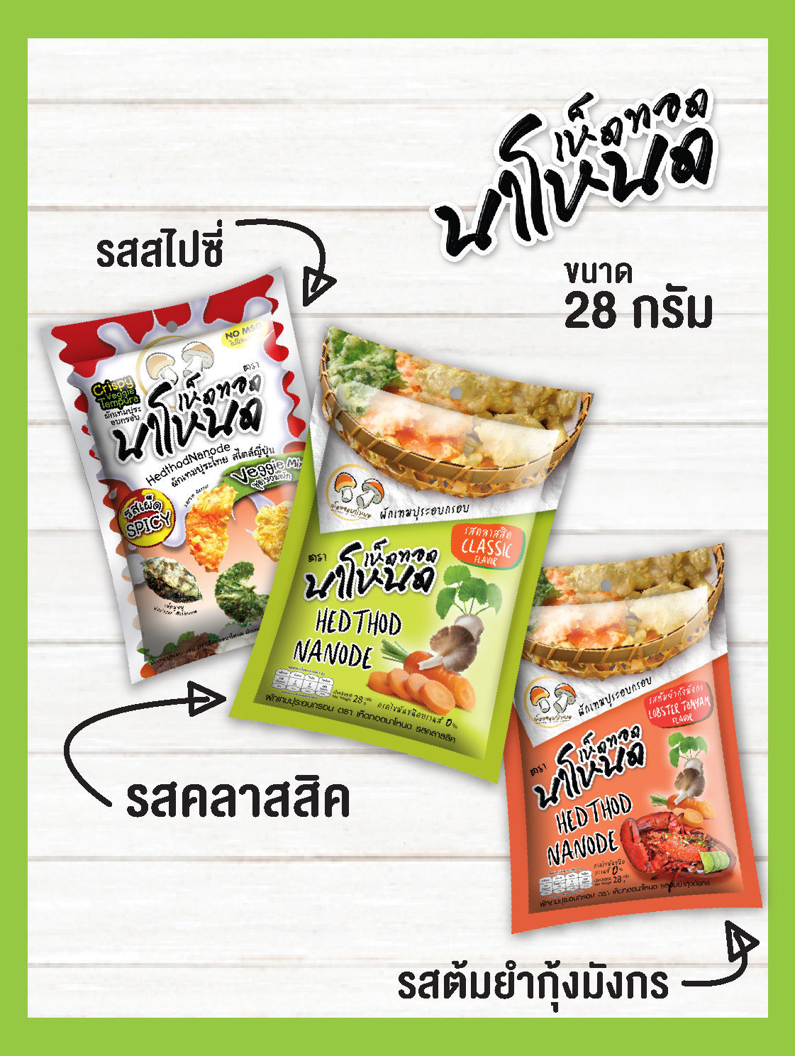 ตำนานแห่งเห็ดและผักชุบแป้งทอด ด้วยแป้งสูตรพิเศษตั้งแต่ปี พ.ศ.2543 กรอบอร่อยไม่อมน้ำมัน โดยการนำภูมิปัญญาไทยมาปรับปรุงต่อยอดเป็นสแน็คผักเทมปุระเจ้าแรกของประเทศไทย ในนาม "เห็ดทอดนาโหนด"